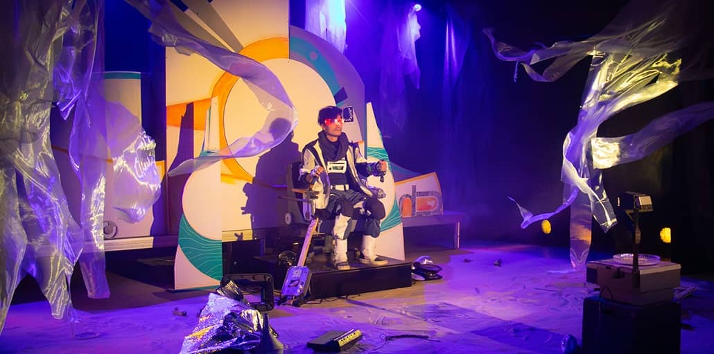 El cosmonauta, personaje dentro de la pieza teatral se encuentra en el espacio con otros seres que bien pudiesen ser alienígenas o no, esa interpretación corresponde al espectador.