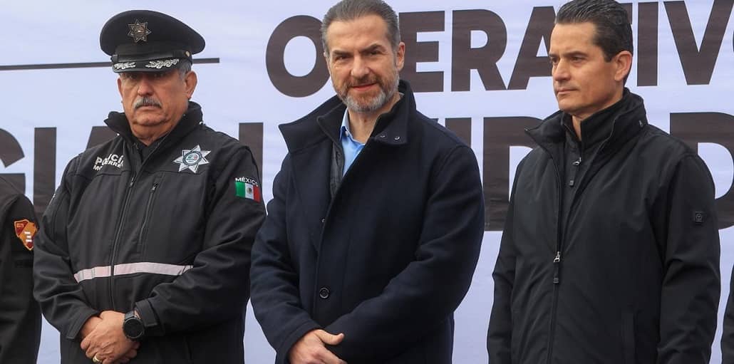 En este dispositivo conjunto con autoridades estatales y federales, participan oficiales de Policía, Tránsito, Guardia Auxiliar, Cadetes, Protección Civil, Cruz Roja y Bomberos Nuevo León.