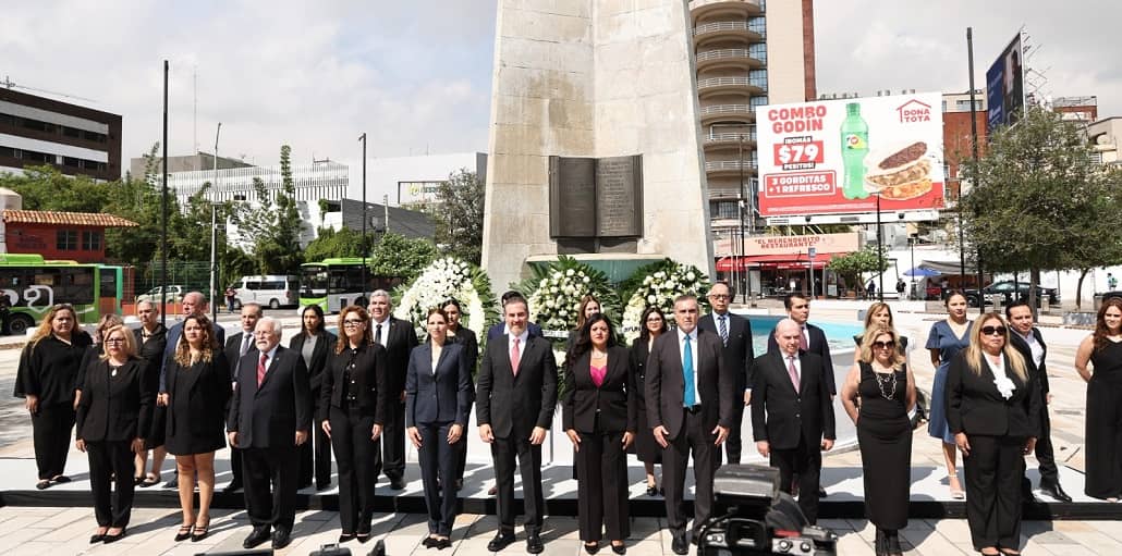 El acto solemne se llevó a cabo en la también llamada Columna de los Fundadores, inaugurada en 1957 en el punto histórico donde se reconoce el origen de Monterrey, fundada por Diego de Montemayor y 12 familias españolas en 1596.
