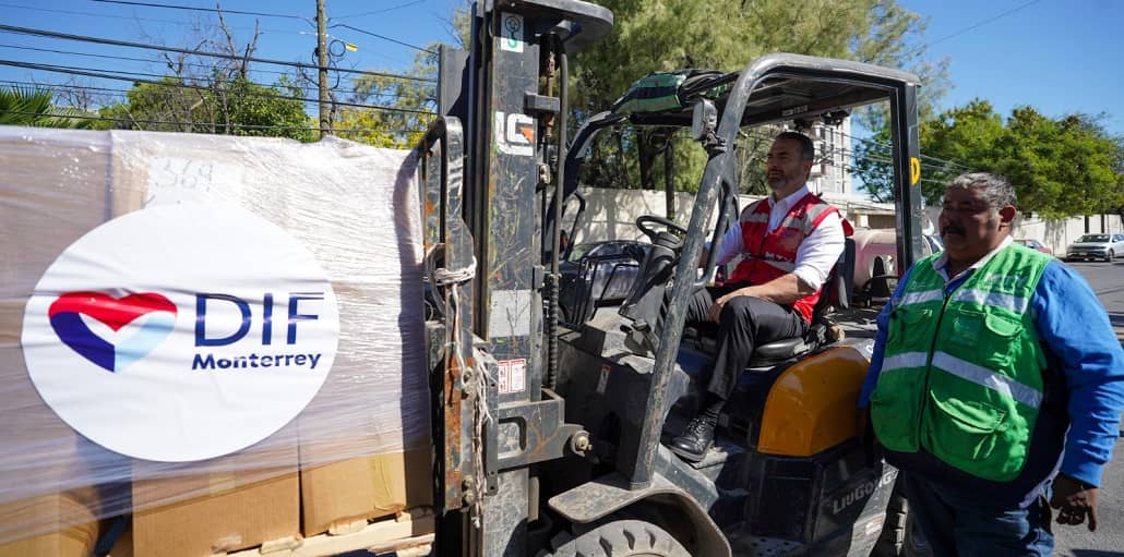 El edil apoyó conduciendo el montacargas que subió las 63 tarimas acopiadas, casi 40 toneladas, y agradeció a los regiomontanos que apoyaron la causa.