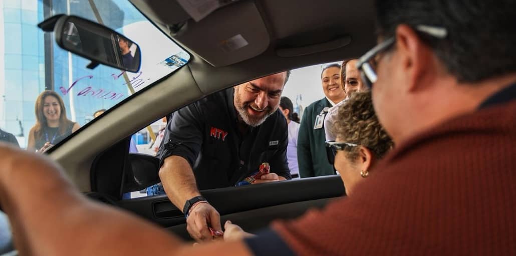 El edil, acompañado por su esposa la presidenta del DIF, Gaby Oyervides, e integrantes del gabinete recorrieron los módulos Drive Thru instalados en el estacionamiento de la Arena Monterrey, así como los que brindaron servicio a los peatones.